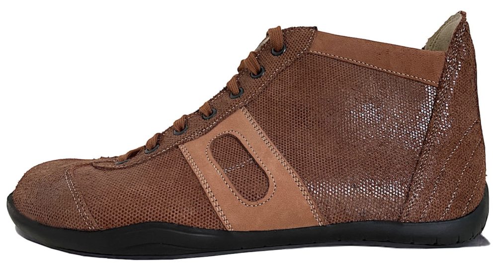 Der Knöchel-Barfußschuh „Diavolo“ in einem wunderschönen braunen Leder. Das Leder sieht aus wie perforiert, ist jedoch ein Glattleder aus Rind. Das Braun hat bei einem bestimmten Lichteinfall einen feinen Glanz, welcher über den ganzen Schuh wandert. Das Leder wird exklusiv für Barfußschuhe von Senmotic in einer Gerberei gefertigt. Wer das Außergewöhnliche mag und auf coole Farben steht, erhält einen außergewöhnlichen Barfußschuh. Wir fertigen das Modell „Diavolo Two“ aus Vollleder. Also auch die Kappen vorn und hinten sind in diesem wunderschönen Braunton gefertigt. Wie alle unsere Barfußschuhe wird auch dieses Sondermodell mit der Hand gefertigt. Durch den speziellen Schnitt wirken die Schuhe am Fuß schmaler. Trotzdem haben die Zehen genügend Raum durch unsere breite Zehenbox. Achtung! Dieses Leder darf nur mit einem leicht feuchten Tuch und mit Imprägnierspray behandelt werden.
